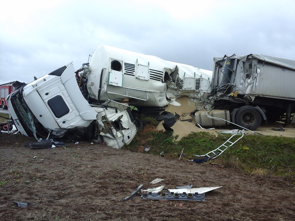 W pobliżu miejscowości Puchały Stare z nieznanych przyczyn zderzyły się dwie ciężarówki. W wyniku zderzenia jeden z zestawów przewrócił się na bok i przygniótł kabinie drugiego zestawu, w której został zakleszczony kierowca.